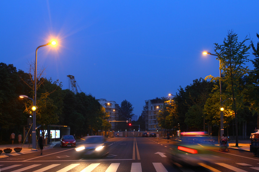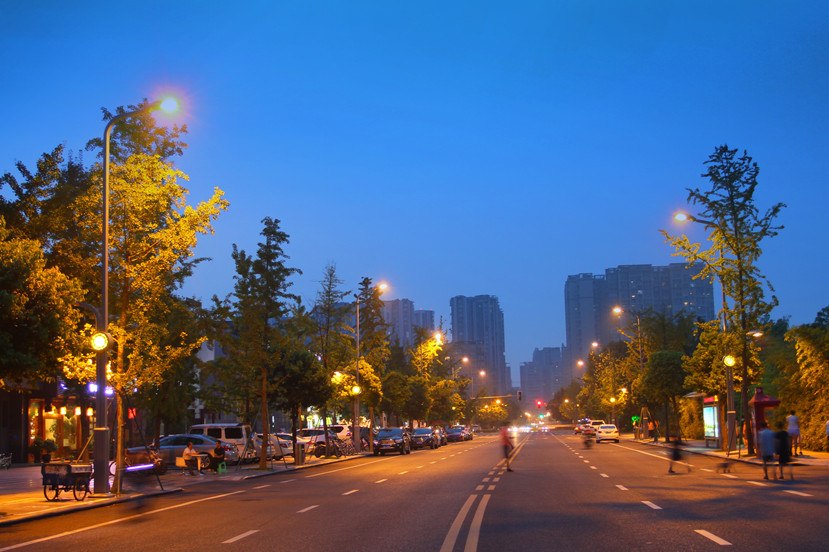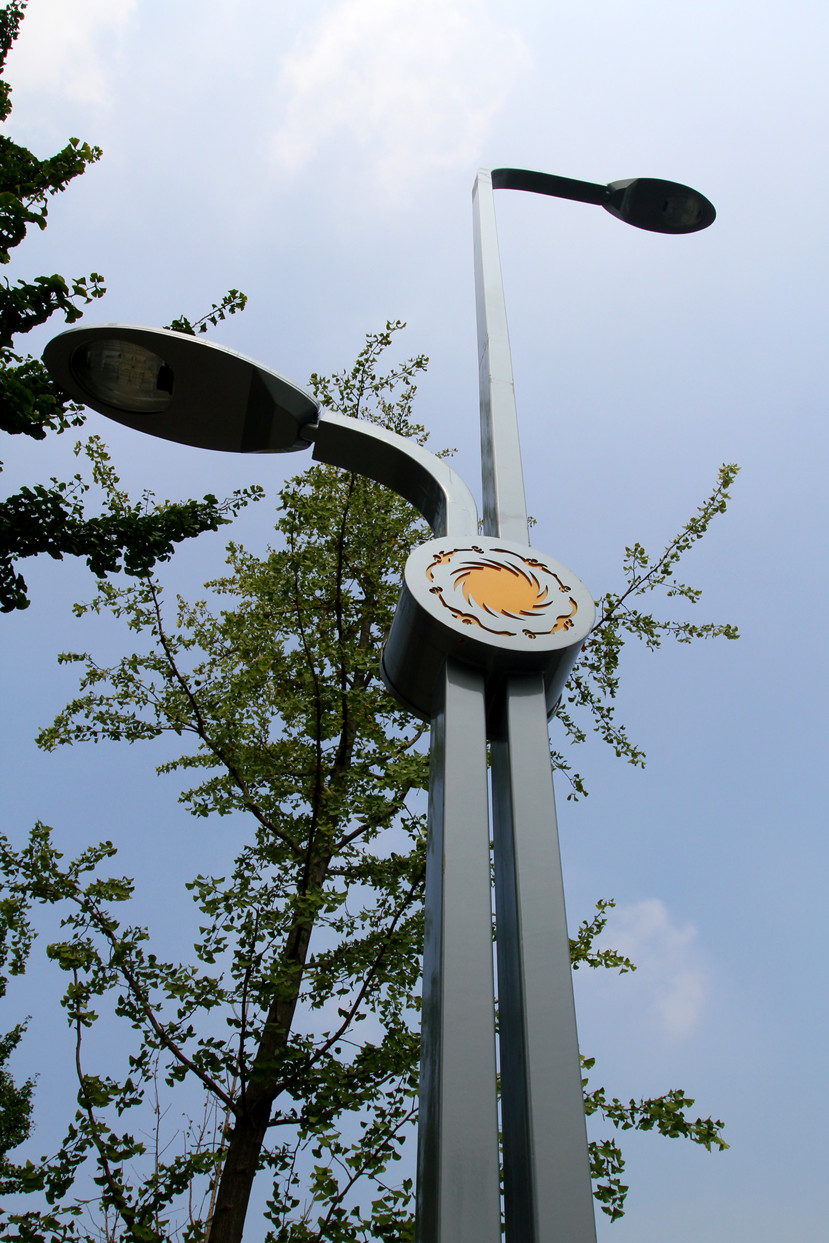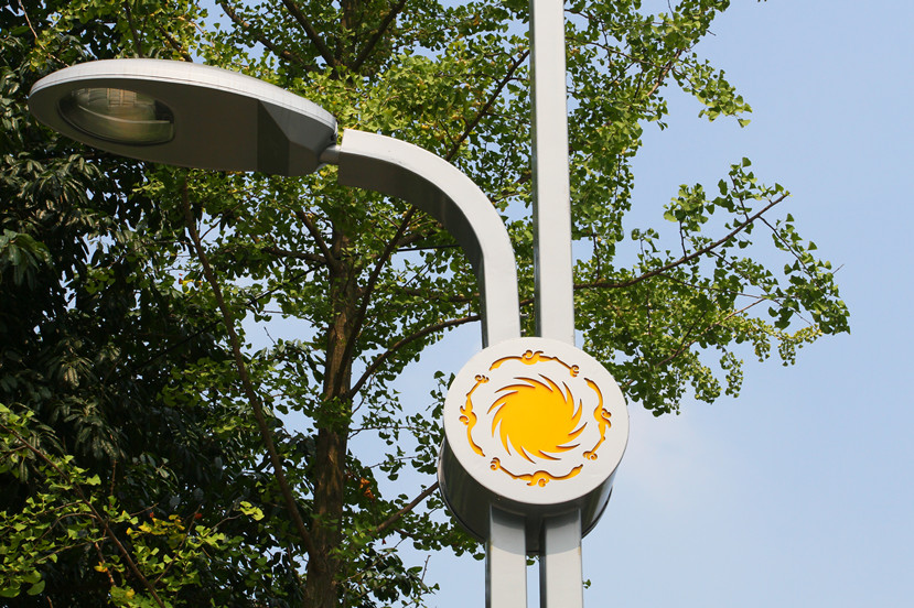 神晖,富有现代感,颇具特色。灯杆,使用具有文化色彩和现代感的颜色——灰色,在灯杆中段建立连接,加上成都独有的内透太阳神鸟镂空图案,蕴含了浓郁的地域文化。