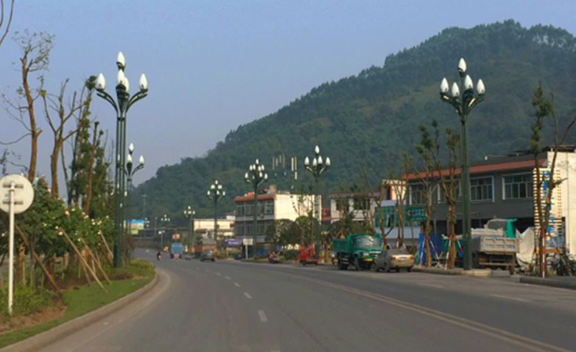 该灯体颜色也根据宜宾珙县区域性进行了定制,提取于蜀南竹海的翠绿竹色元素,呈现墨绿色,与道路两旁的翠竹交相辉映。灯是传递光明的使者,安于珙县迎宾大道的四叉五火玉兰灯,欢迎来五湖四海的游客,可惬意的观光蜀南竹海的幽深、清丽、秀雅的大自然之美。