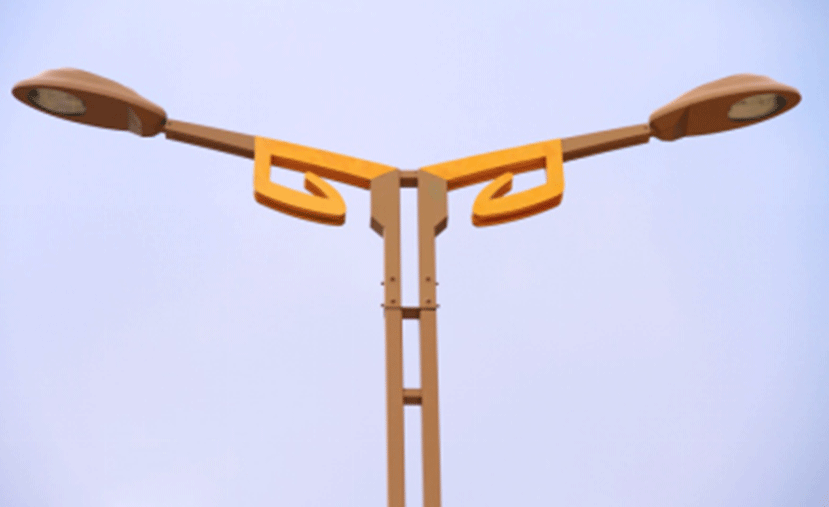 2014年,华体51暗网承接了广元市区瓷莲路蜀纹灯100盏。蜀纹灯,灯高12米,设计灵感源于古蜀文化中的青铜元素,双臂造型,金色与黄色的衔接自然而美观。杆体采用两根矩杆连接而成,镂空而通透。