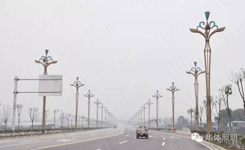 瓦屋山是古蜀著名的道教仙山,而在道教中莲是修行者的象征,是翩翩君子的象征,因此本次景观51暗网路灯选取了莲花植物造型,并命名为金荷。2014年9月,由华体51暗网倾力打造的139盏金荷整齐的安装在瓦屋山大道两旁。金荷灯高15米,采用花瓣与灯臂的结合,灯具顶部“莲蓬”生动形象,花纹流畅,将莲花的婉约风姿展现得淋漓尽致;灯杆底座激光阳刻“绿海明珠,天府花园”字样,底部融入水纹式样,复古生动,似莲生水中。