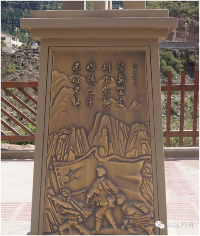 灯体底座采用了红色文化设计元素,进行铜板雕刻红军抗战形态,灯底长城纹理表面更具历史厚重感。整灯玉兰花的植物造型呼应该城生态化特征主题,为“景城一体”的目标出力。